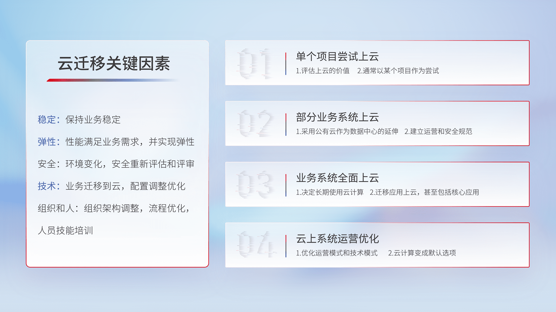 结合实际业务,,,,从规划设计、、、云平台选型、、、云原生改造、、、、数据迁移、、、集成交付,,迁移全过程为客户识别最佳上云路径,,做好风险识别管理,,,设计网络架构、、身份权限、、、、安全审计合规、、、操作审计、、日志审计、、、、监控告警策略、、多站点容灾设计等,,,,对云上基础设施进行整体规划,,,提升IT治理水平,,,,以满足弹性、、、、高可用、、、高性能的需求。。。