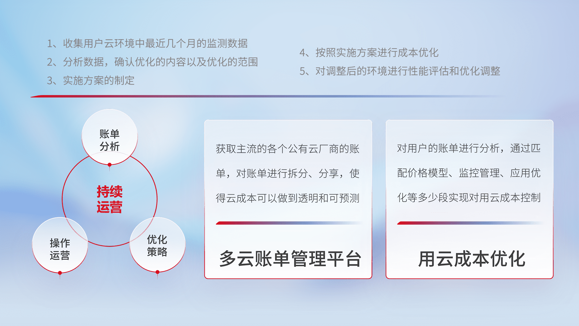 通过多云纳管,,,以统一的资源数据模型把客户的云资源进行抽象和封装,,进而实现对多云资源的统一操作,,,,保障云资源管理的可靠性、、、稳定性与可用性。。。。量身定制化运维内容,,配置、、、开发运维、、、、补丁管理、、、、备份、、、监控、、、认证和访问管理、、审计和日常巡检等,,,,保障在用云过程中的可靠度,,,稳定度以及高可用率。。。。